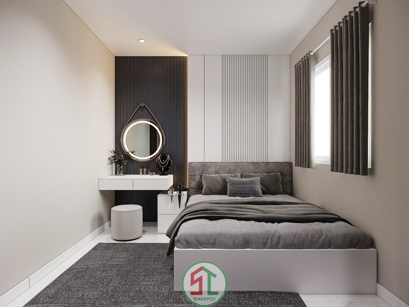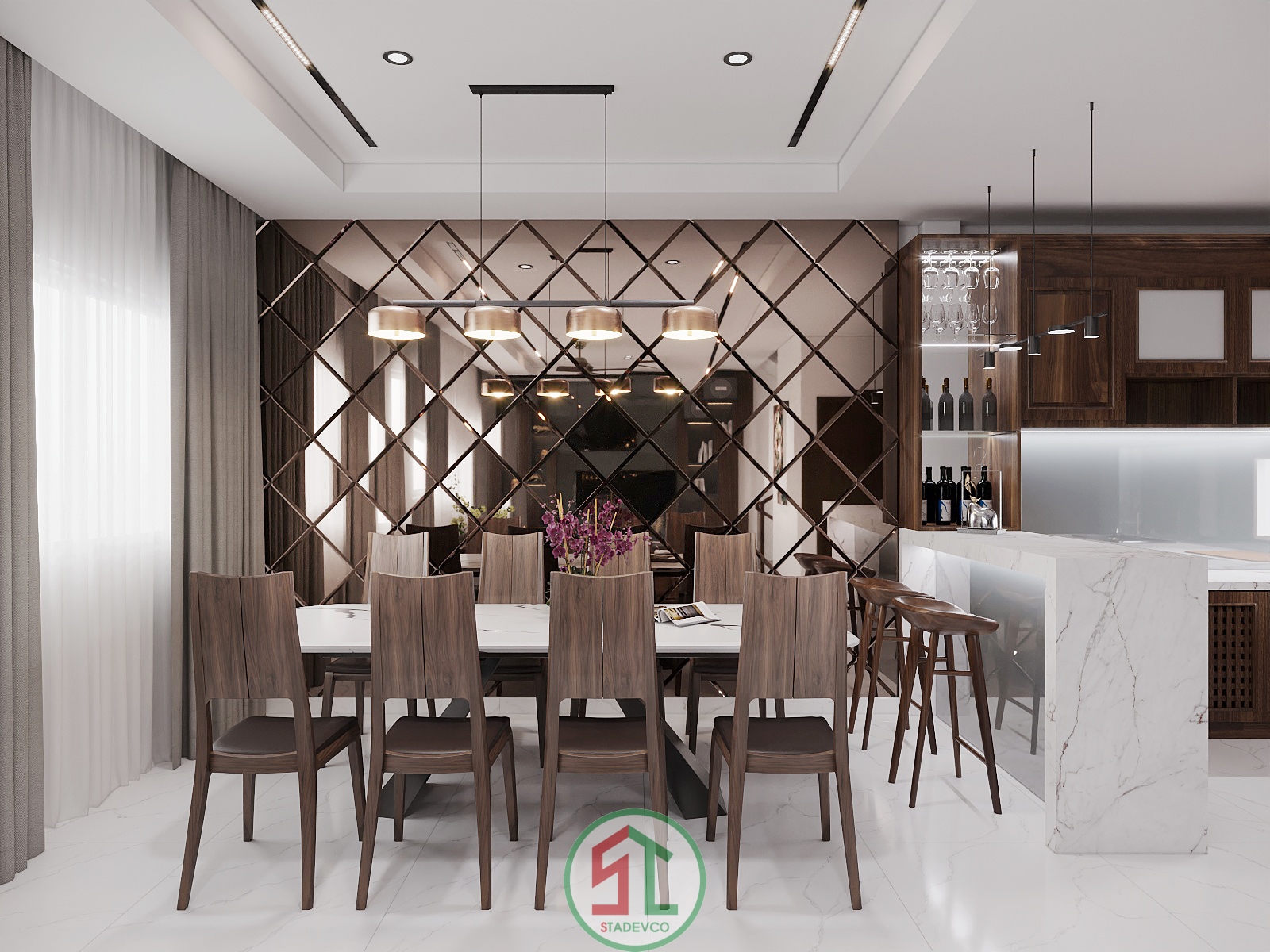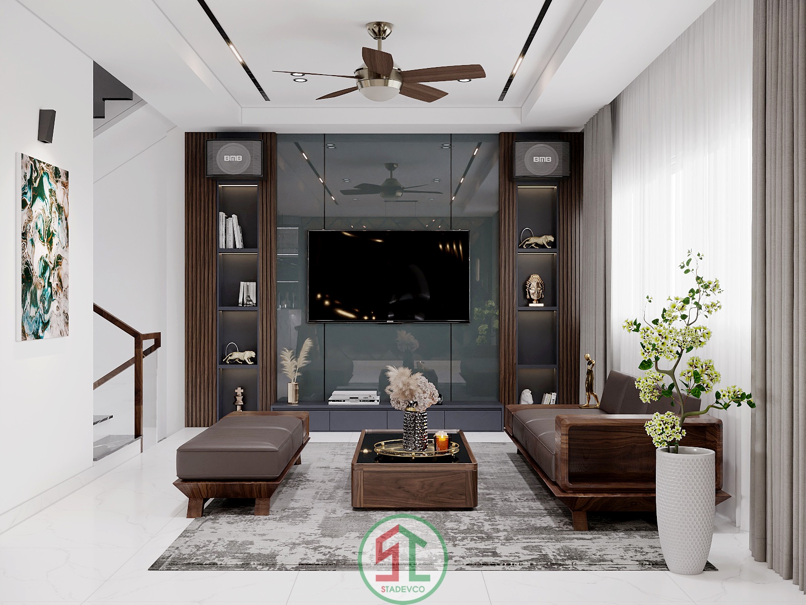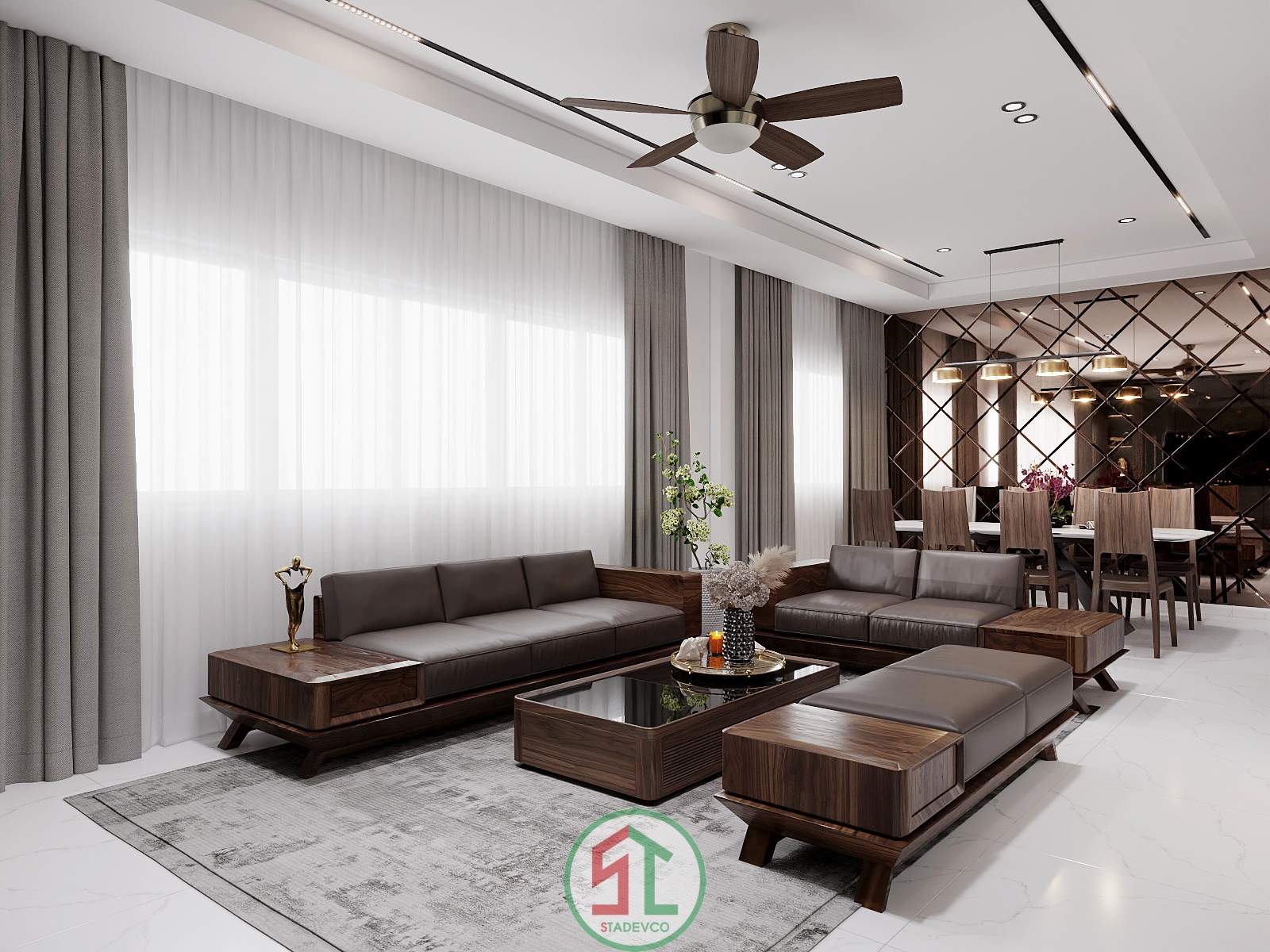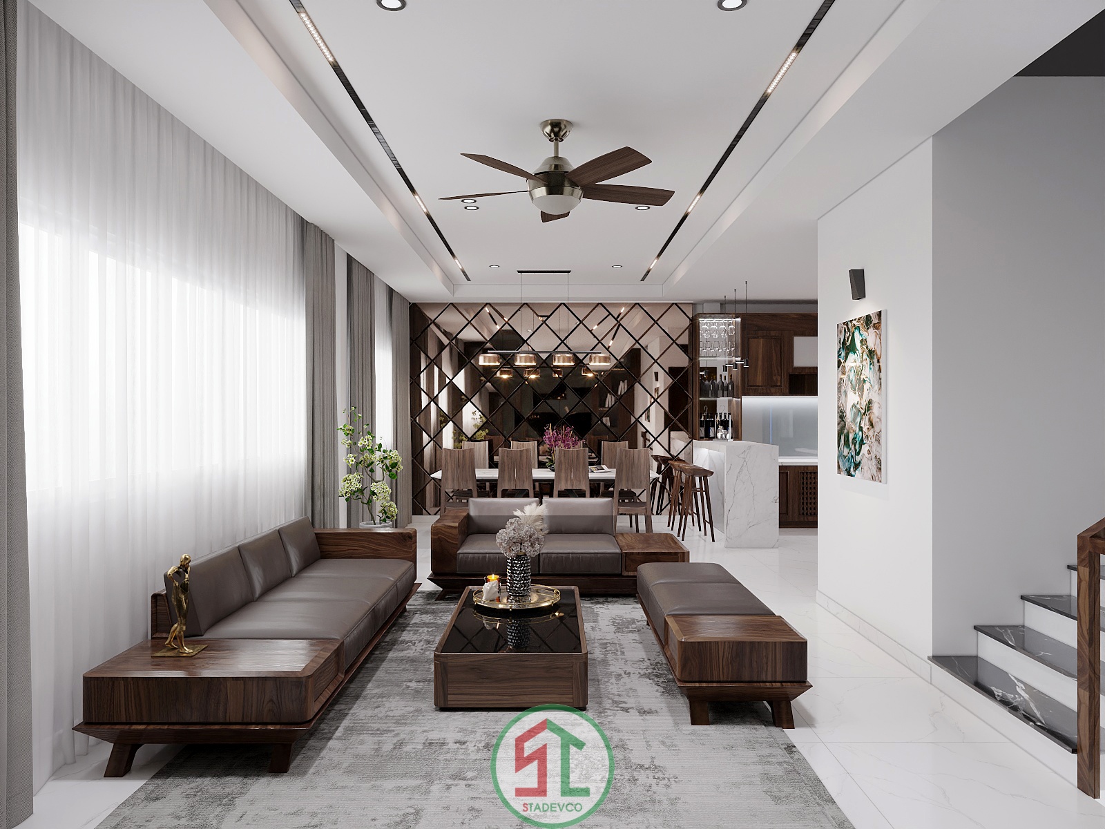 Bên cạnh đó, Stadevco tinh tế sử dụng cửa kính lớn và rèm hai lớp để tận dụng ánh sáng tự nhiên, mang lại cảm giác gần gũi và thoáng đãng – yếu tố rất được ưa chuộng trong thiết kế nhà phố hiện đại.
