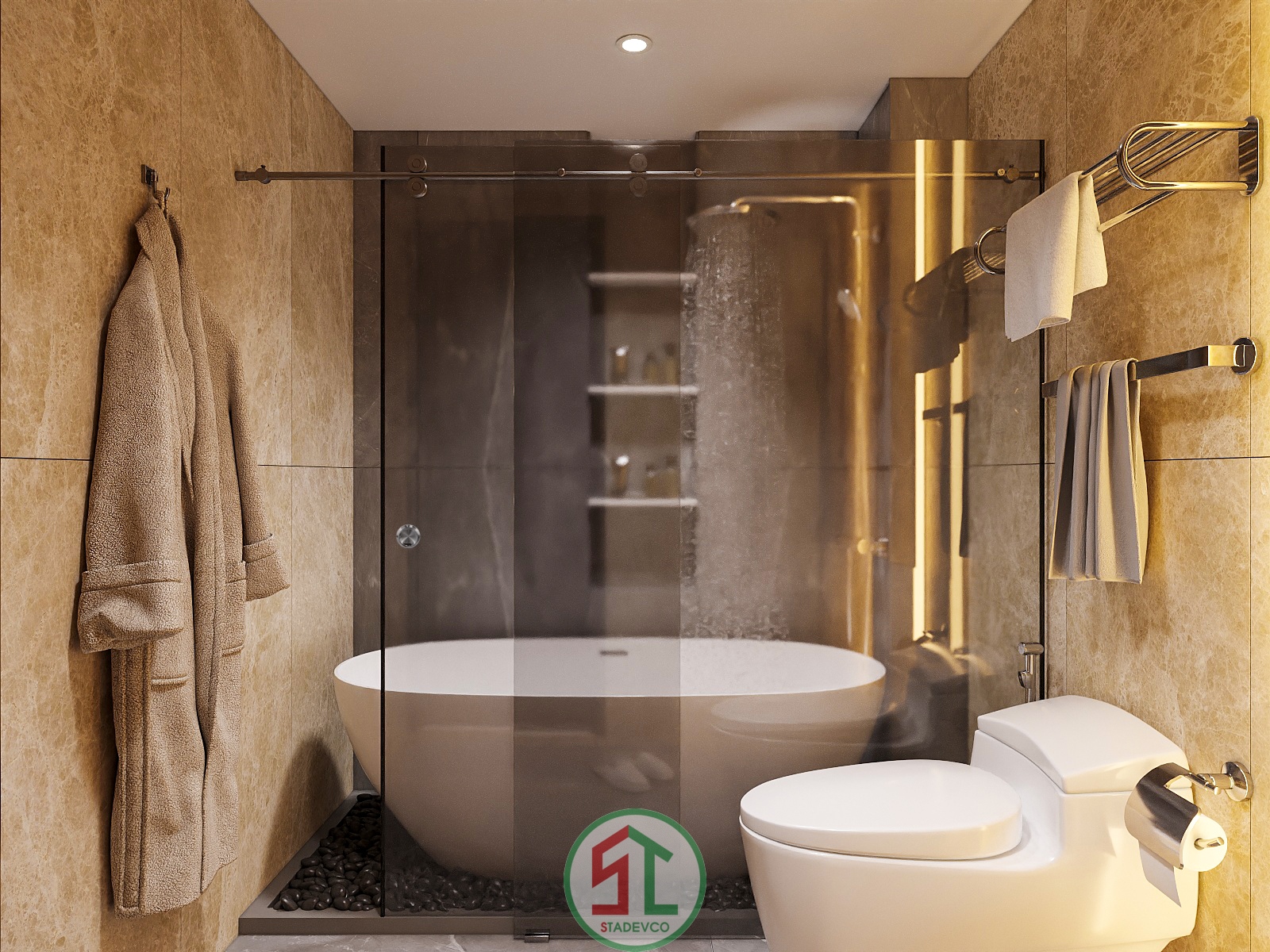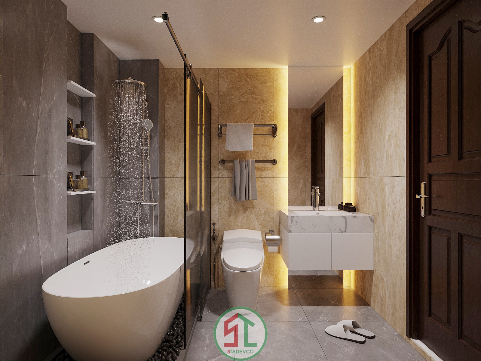 - Phòng tắm master: sử dụng tông nâu be ấm, vật liệu ốp đá marble, bồn tắm đặt giữa không gian, ngăn bằng kính cường lực trượt sang trọng. Từng chi tiết nhỏ như giá treo khăn, đèn âm tường hay móc áo đều được lựa chọn tỉ mỉ để đảm bảo tính đồng bộ và sang trọng.