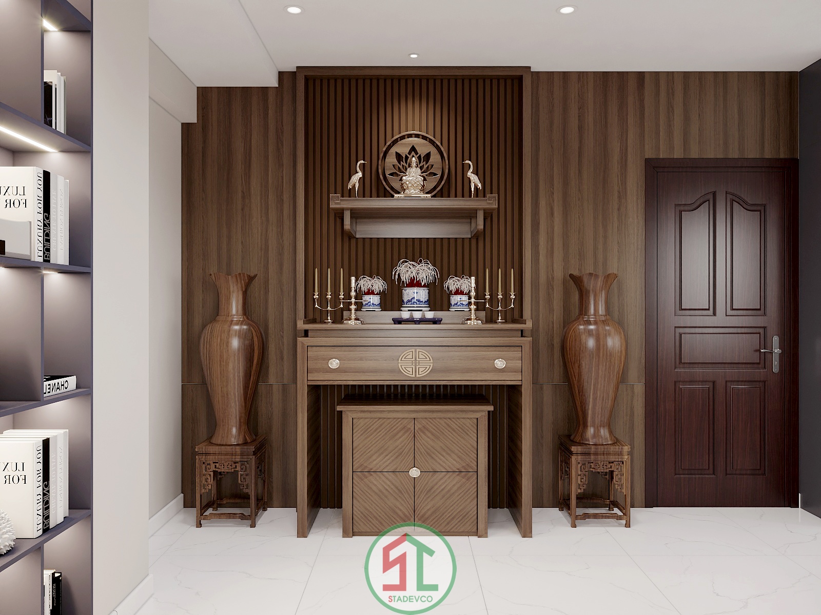 Đội ngũ thiết kế của Stadevco chú trọng đặc biệt vào yếu tố phong thủy và tâm linh, đảm bảo không gian thờ cúng vừa trang trọng, vừa hài hòa với tổng thể hiện đại của ngôi nhà.