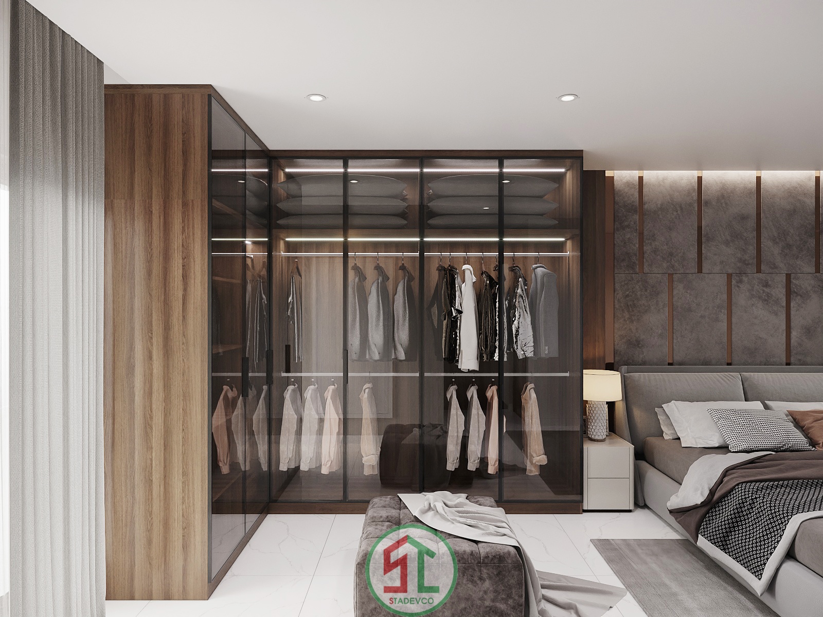 Tủ quần áo dạng kính trong suốt kết hợp đèn LED âm bên trong mang lại cảm giác hiện đại, tiện nghi và đẳng cấp. Gam màu trung tính (xám – be – nâu gỗ) giúp gia chủ dễ dàng thư giãn, tạo giấc ngủ sâu và cảm giác dễ chịu sau một ngày dài.