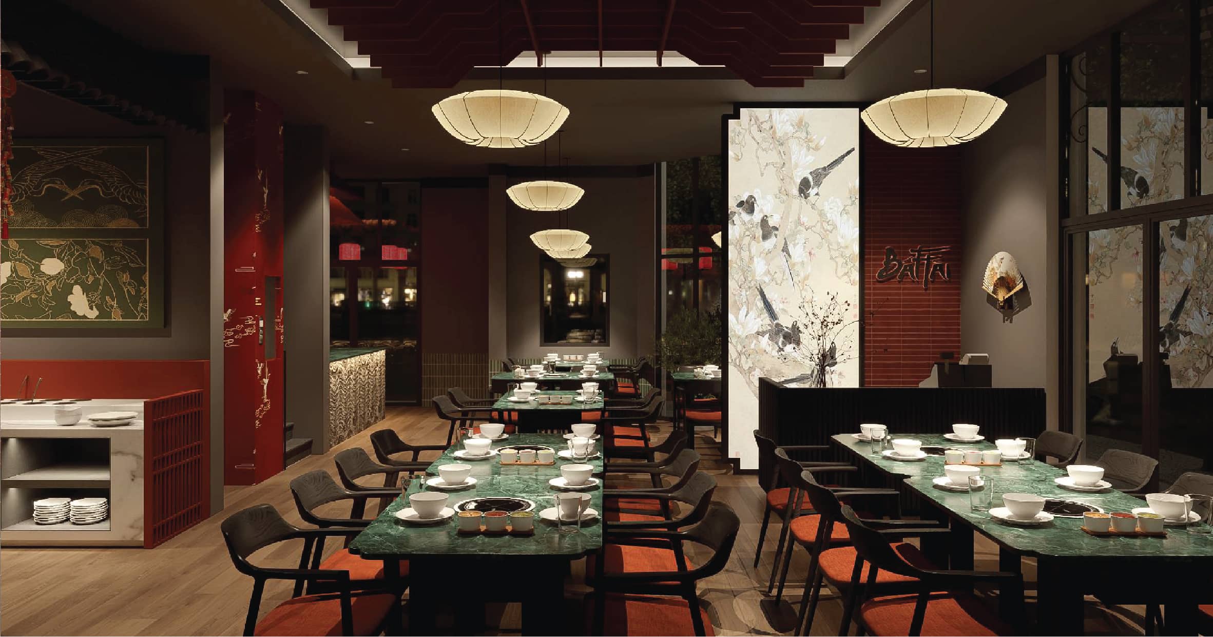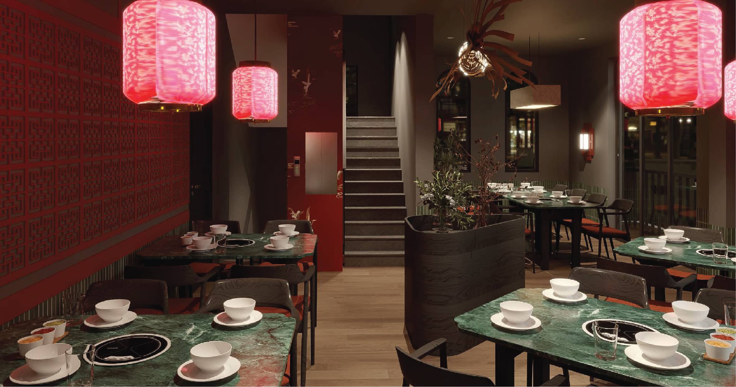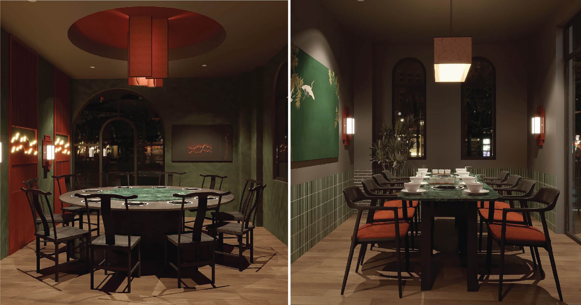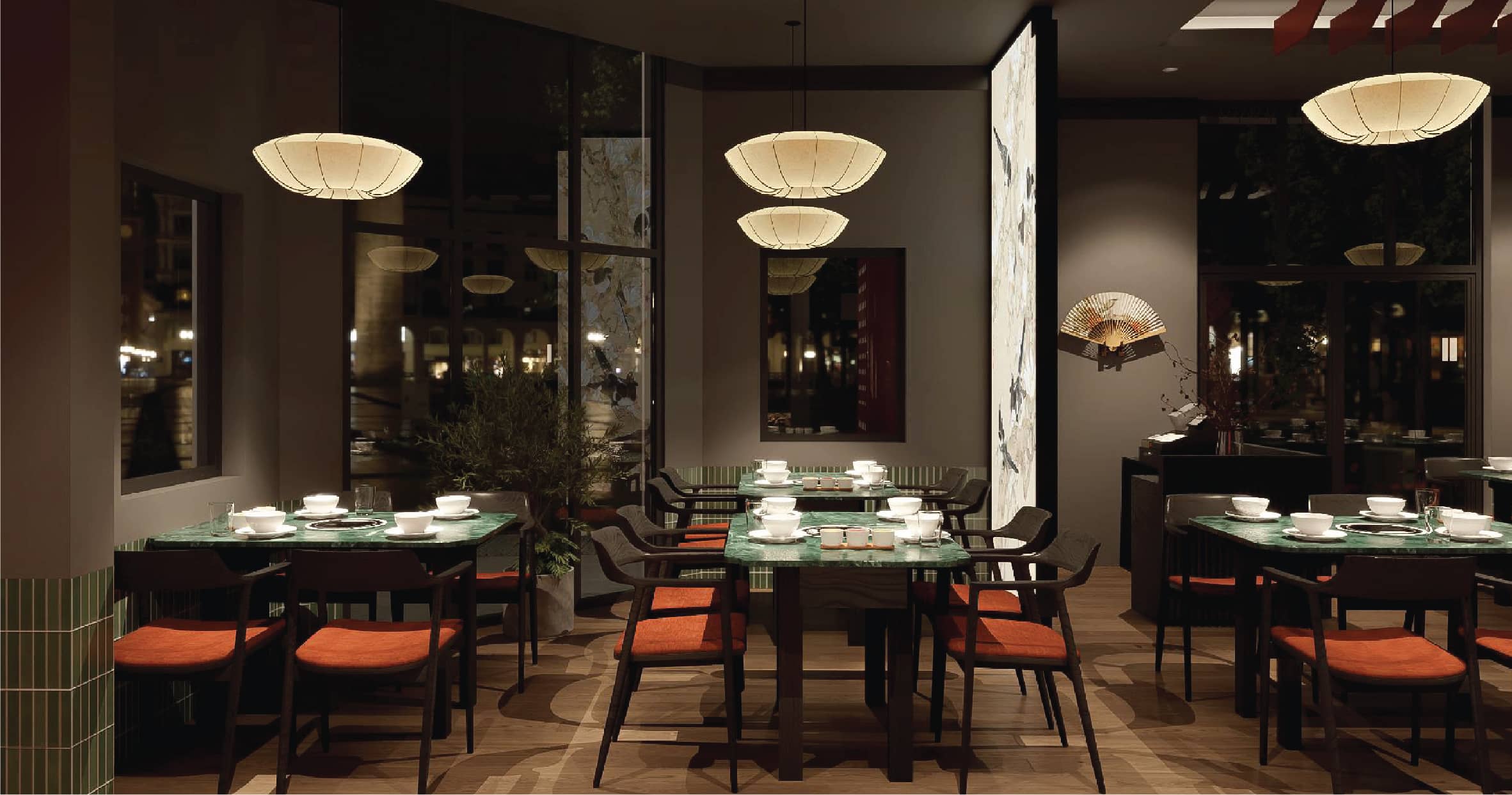 Các chi tiết trang trí như đèn lồng, tranh thủy mặc, họa tiết truyền thống được sử dụng có chọn lọc, tạo nên bản sắc riêng cho nhà hàng mà không gây nặng nề thị giác.