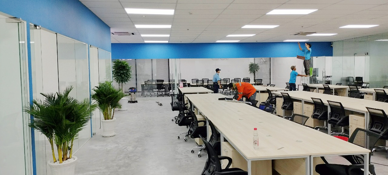 • Màu sắc chủ đạo: Sự kết hợp giữa màu trắng/kem (trần, tường, mặt bàn), màu vân gỗ sáng (mặt bàn), và màu xanh dương (tường nhấn, logo) tạo nên một môi trường làm việc tươi sáng, chuyên nghiệp và đầy năng lượng.