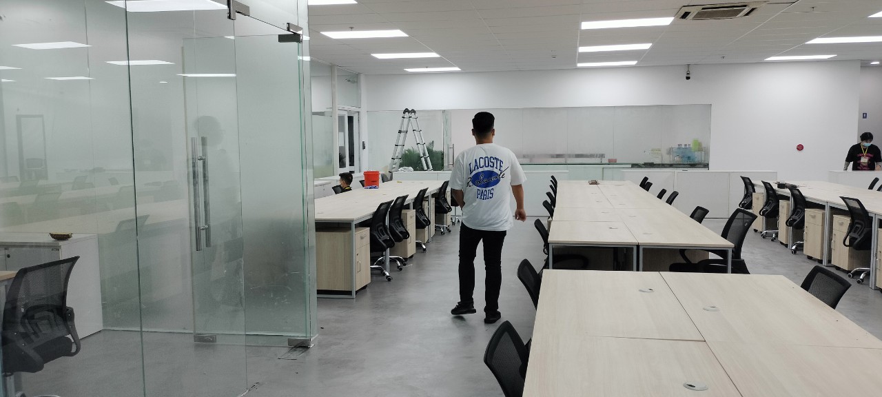 • Vách ngăn: Các vách ngăn cứng được thay thế bằng hệ thống vách kính trong suốt (như hình ảnh), giữ lại sự riêng tư âm thanh cần thiết cho khu vực văn phòng chính và phòng họp, đồng thời duy trì sự liên thông thị giác, giúp không gian trở nên rộng rãi và thoáng đãng hơn.