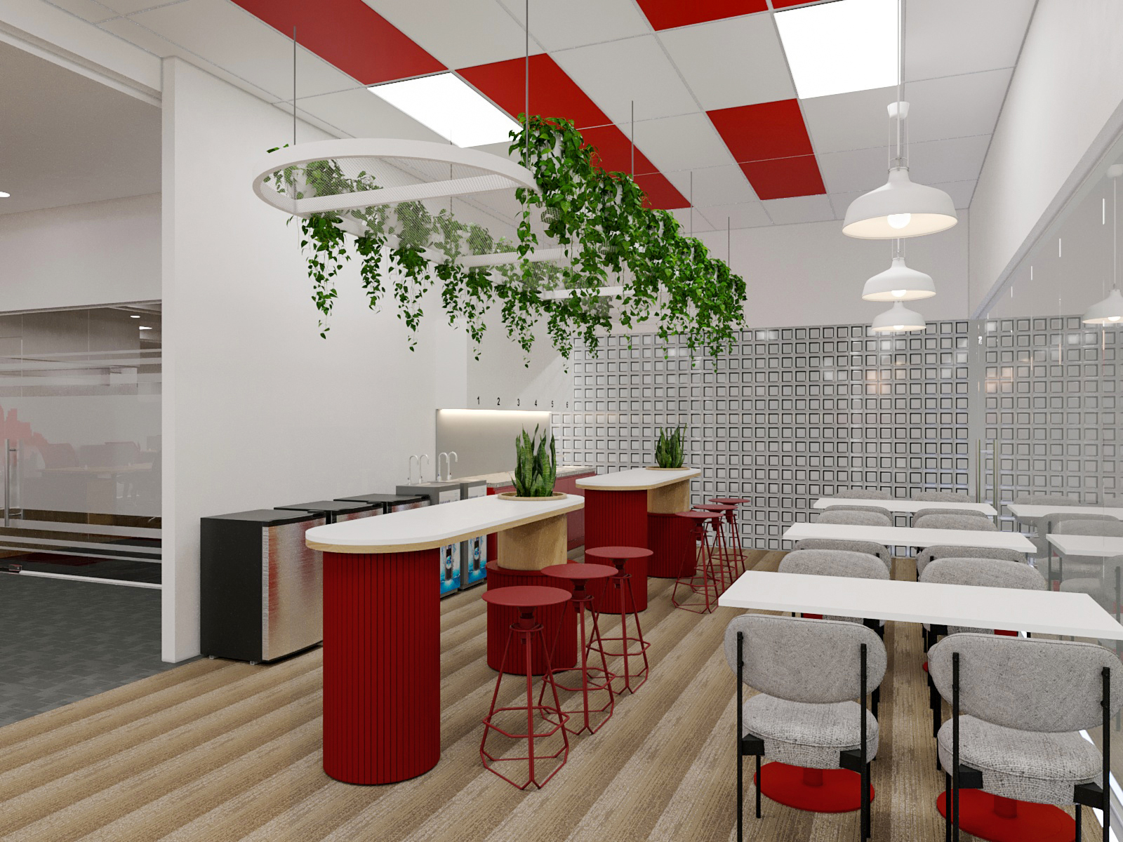 Thiết kế hiện đại, trẻ trung: Khu vực pantry được thiết kế với sự kết hợp hài hòa giữa màu trắng tinh tế và màu đỏ năng động, đồng bộ với nhận diện thương hiệu. Trần nhà sử dụng các ô vuông đỏ trắng xen kẽ, tạo điểm nhấn độc đáo và vui mắt.