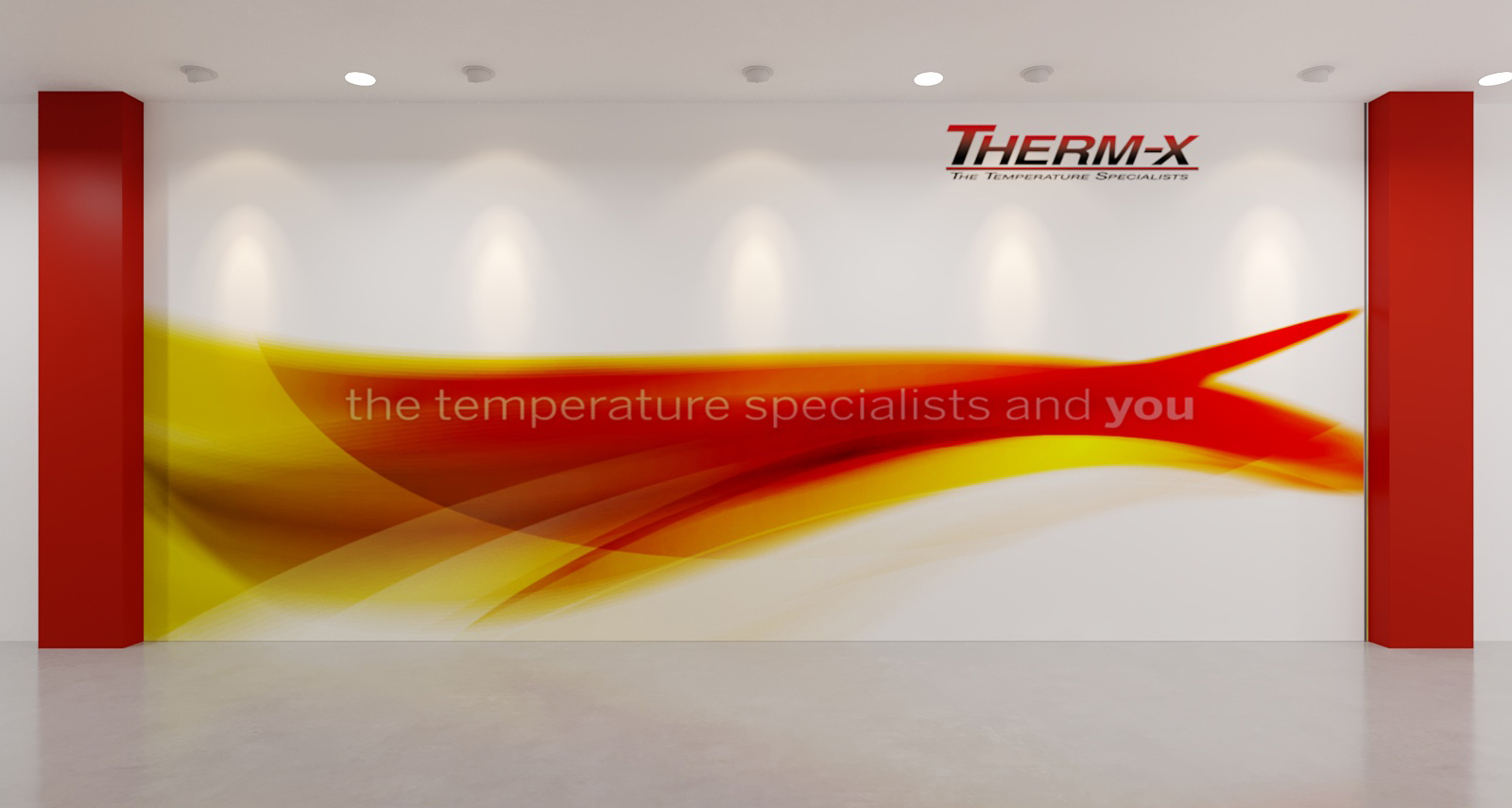 Khu vực tiếp tân/Sảnh chờ: Một bức tường nghệ thuật lớn với logo Therm-X và thông điệp thương hiệu được chiếu sáng nổi bật, khẳng định hình ảnh chuyên nghiệp ngay từ lối vào.