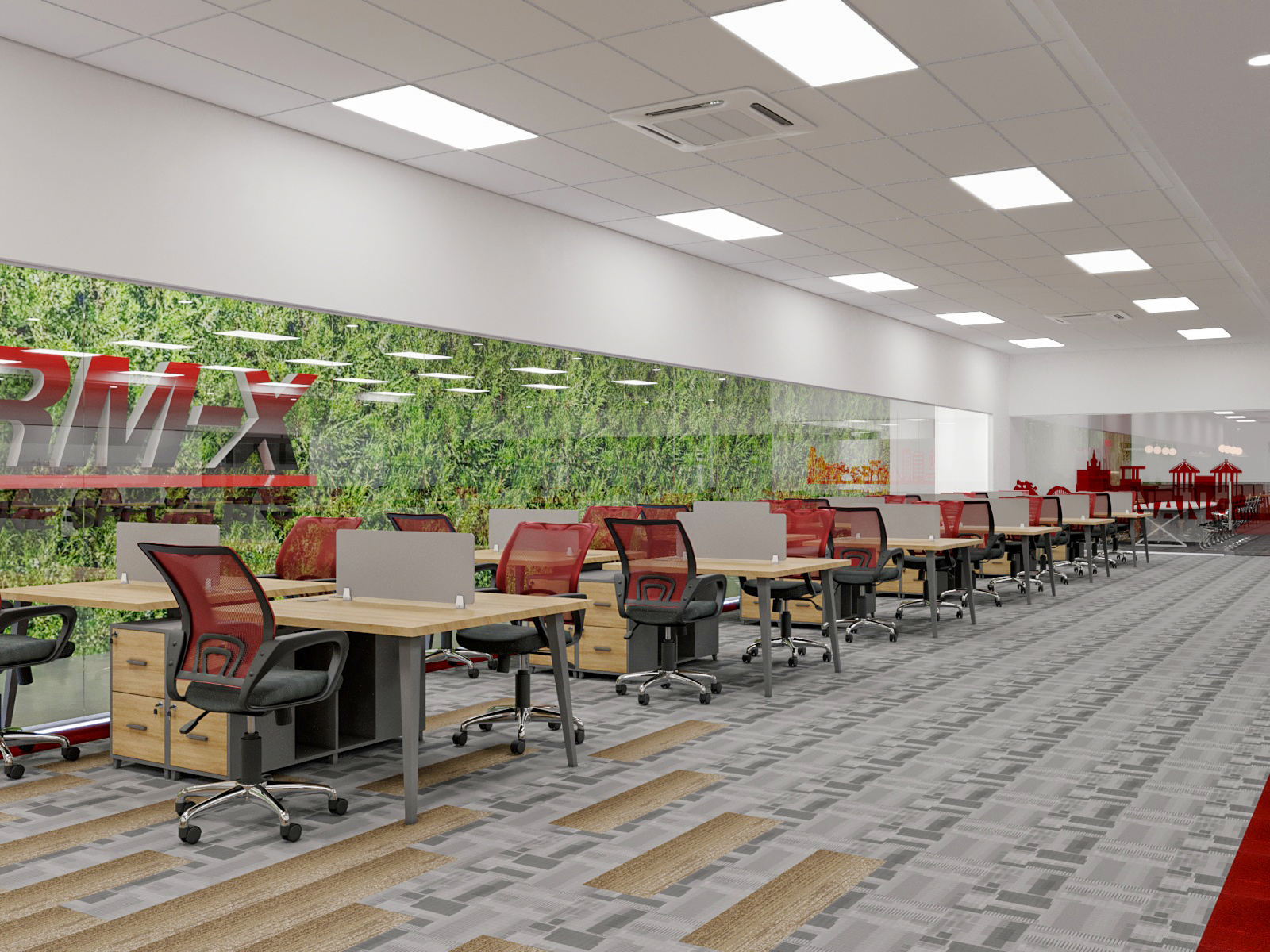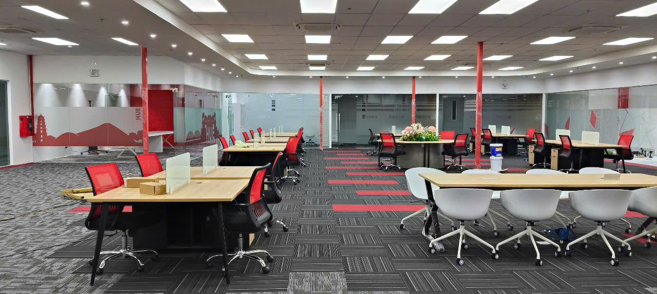 Nội thất công thái học: Ghế văn phòng được lựa chọn với thiết kế lưới, màu đỏ và đen nổi bật, không chỉ tạo điểm nhấn thị giác mạnh mẽ mà còn đảm bảo sự thoải mái và hỗ trợ tốt cho sứcÁnh sáng chuẩn: Hệ thống đèn trần panel lớn, phân bố đều, cung cấp ánh sáng trắng, đồng đều, mô phỏng ánh sáng tự nhiên, giúp giảm mỏi mắt và duy trì sự tỉnh táo trong suốt giờ làm việc.